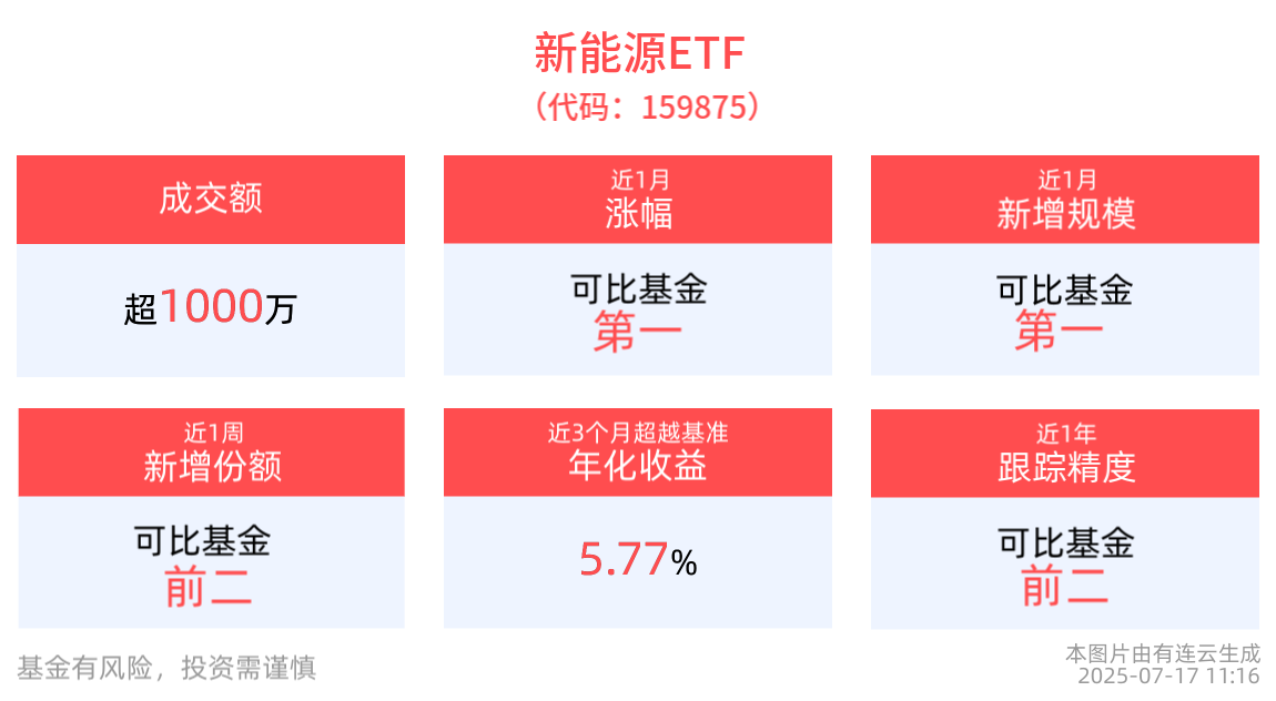 从收益能力看,截至2025年7月16日,新能源ETF自成立以来,最高单月回报为25.07%,最长连涨月数为2个月,最长连涨涨幅为38.44%,上涨月份平均收益率为7.76%。截至2025年7月16日,新能源ETF近3个月超越基准年化收益为5.77%。