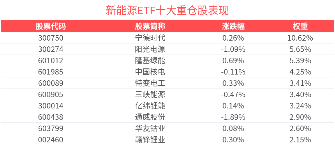 数据显示配资财经网,截至2025年6月30日,中证新能源指数前十大权重股分别为宁德时代、阳光电源、隆基绿能、中国核电、三峡能源、特变电工、亿纬锂能、华友钴业、通威股份、赣锋锂业,前十大权重股合计占比42.81%。